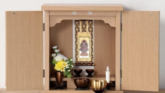 どんなお部屋・仏具にもあわせやすい木目のあるナチュラルなミニ仏壇。こちらだけで十分ご供養できます。大切なあの人をご供養ください。『外寸』幅33cm、奥行26cm、高さ36cm『本尊台サイズ』幅27cm、奥行14cm、高さ4cm『素材』MFD